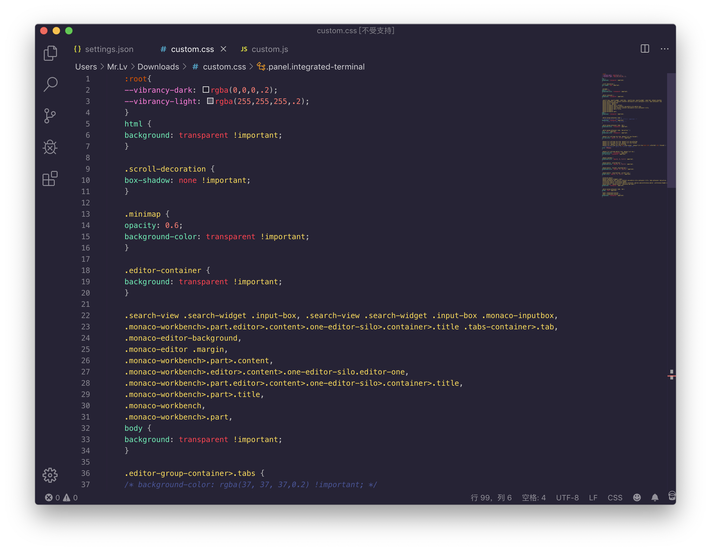 VSCode真的是一款强大的编程软件:它拥有众多类型的扩展和第三方库以及支持众多编程语言。在搭建并配置博客的过程中,本地静态博客的配置文件比如.yml.json.css.swig等各种格式的文件都可以用它打开并修改。如果它拥有一个更为漂亮简洁的UI界面,那势必会使生产力翻倍了!所以当我网上冲浪🏄并留意到美化VS Code界面的关键词时…!!! 本文介绍如何实现VS Code界面的毛玻璃效果~