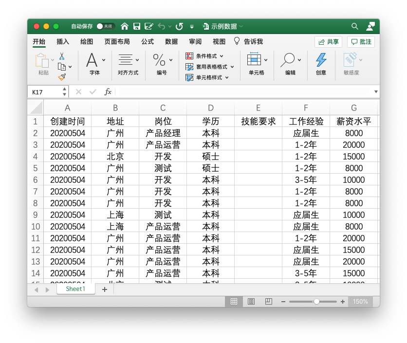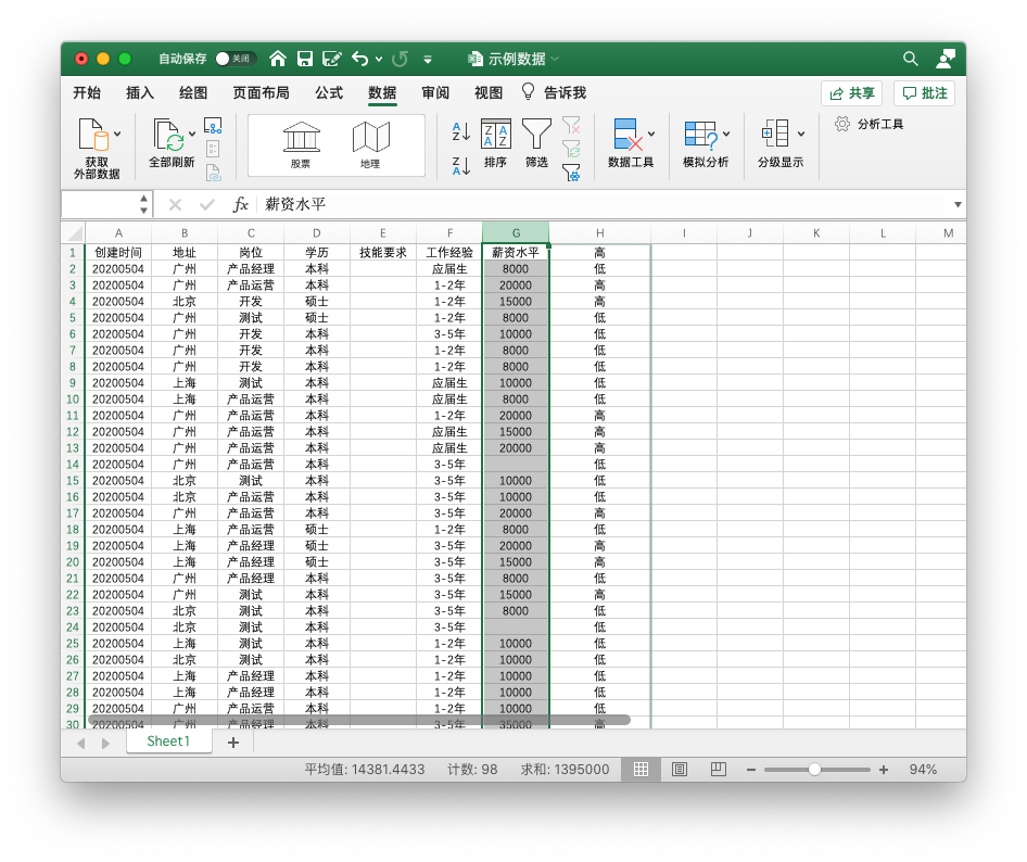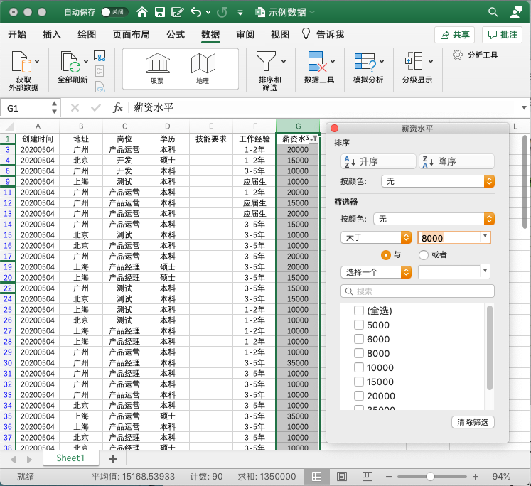 使用我们之前的示例数据,在Excel中筛选出薪资大于8000的数据步骤如下:「选中一列 - 数据 - 筛选 - 大于 - 8000」