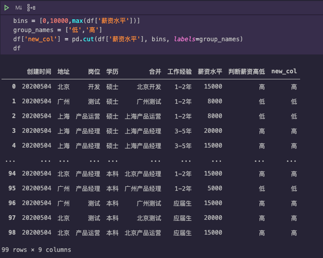 在pandas中,如果不借助自定义函数的话,我们可以使用cut方法来实现同样操作