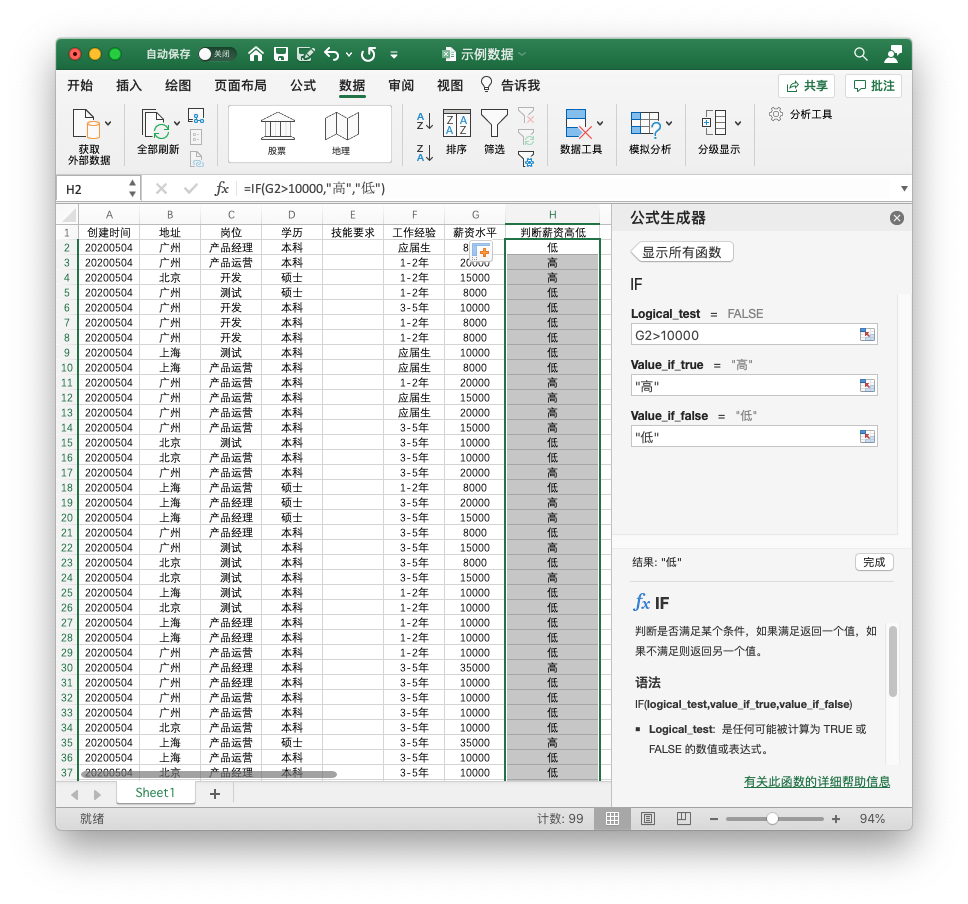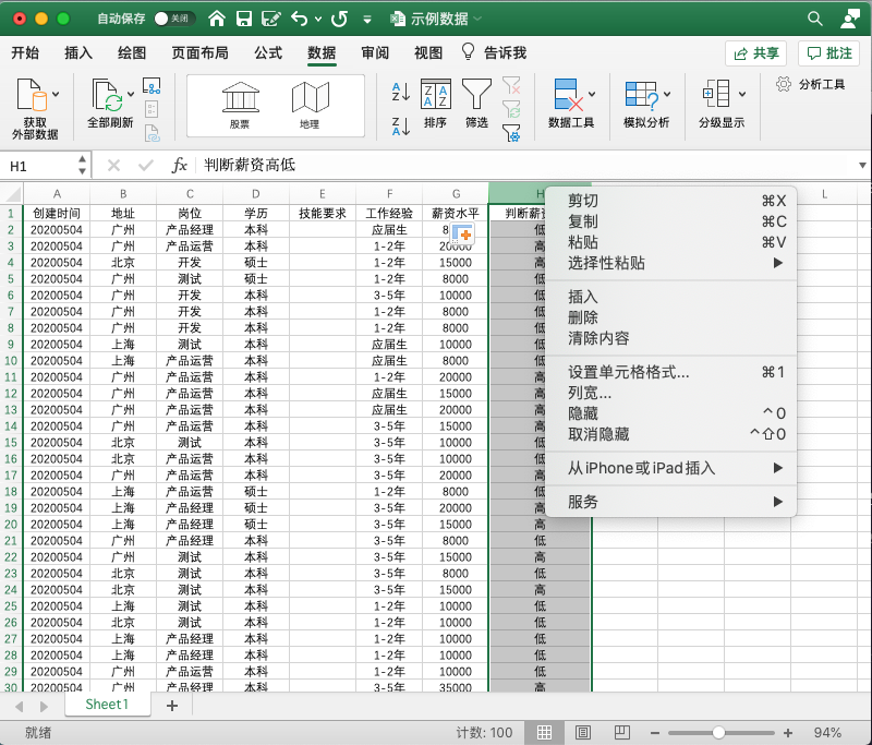 在Excel中我们可以将光标放在指定位置并右键增加一行/列,当然也可以在添加时对数据进行一些计算,比如我们就可以使用IF函数(=IF(G2>10000,”高”,”低”)),将薪资大于10000的设为高,低于10000的设为低,添加一列在最后