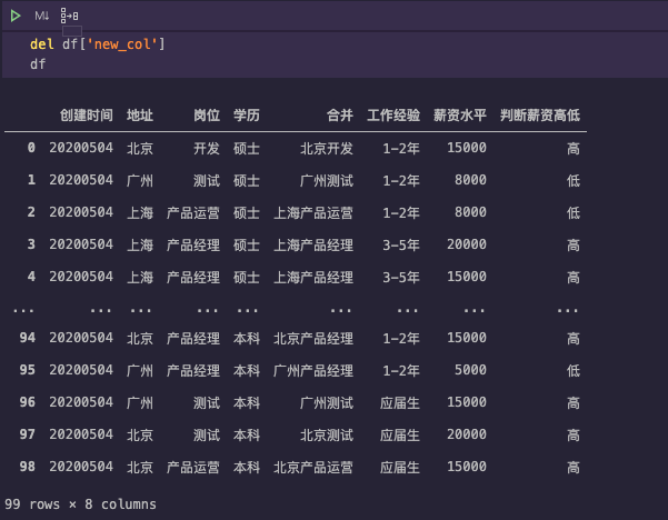 在pandas中删除数据也很简单,比如删除最后一列使用del df[‘new_col’]即可