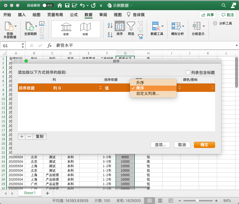 在Excel中可以点击排序按钮进行排序,例如将示例数据按照薪资从高到低进行排序可以按照下面的步骤进行