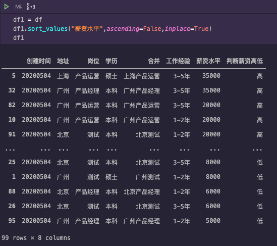 在pandas中可以使用sort_values进行排序,使用ascending来控制升降序,例如将示例数据按照薪资从高到低进行排序可以使用df.sort_values(“薪资水平”,ascending=False,inplace=True)