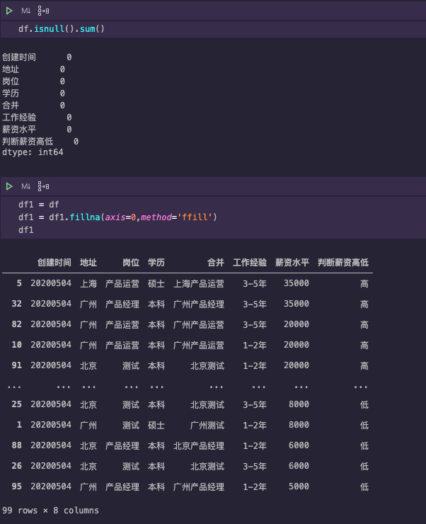 在pandas中可以使用data.isnull().sum()来检查缺失值,之后可以使用多种方法来填充或者删除缺失值,比如我们可以使用df = df.fillna(axis=0,method=’ffill’)来横向/纵向用缺失值前面的值替换缺失值