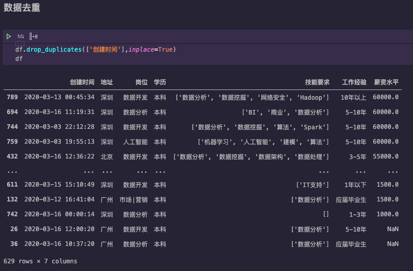 在pandas中可以使用drop_duplicates来对数据进行去重,并且可以指定列以及保留顺序,例如对示例数据按照创建时间列进行去重df.drop_duplicates([‘创建时间’],inplace=True)。