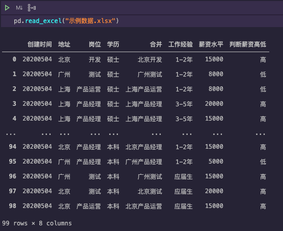 Pandas支持读取本地Excel、txt文件,也支持从网页直接读取表格数据,只用一行代码即可,例如读取上述本地Excel数据可以使用:pd.read_excel(“示例数据.xlsx”)