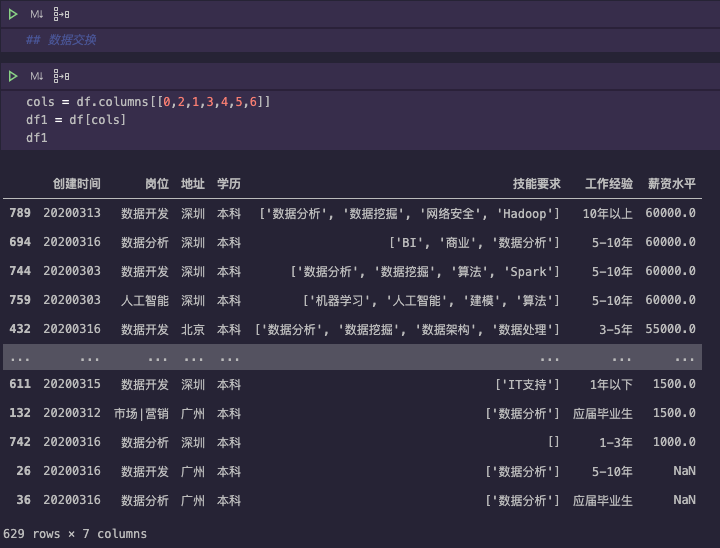 在pandas中交换两列也有很多方法,以交换示例数据中地址与岗位两列为例,可以通过修改列号来实现