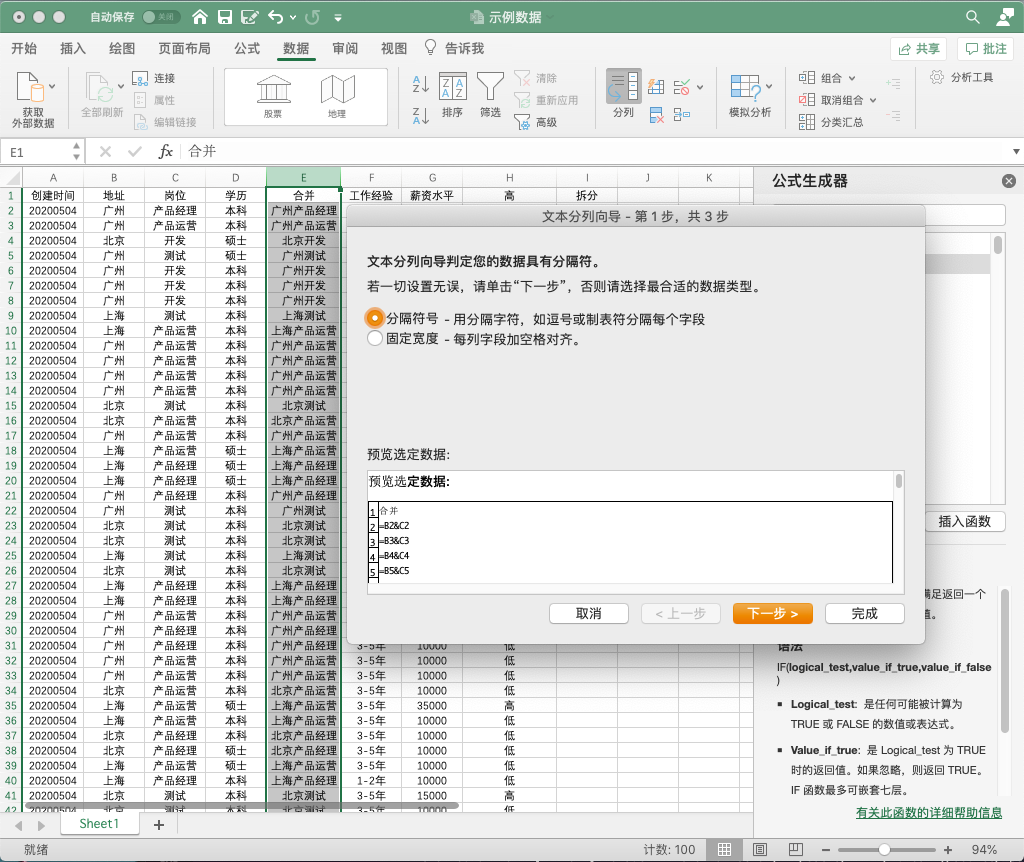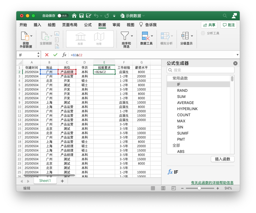 在Excel中可以使用公式也可以使用Ctrl+E快捷键完成多列合并,以公式为例,合并示例数据中的地址+岗位列步骤如下