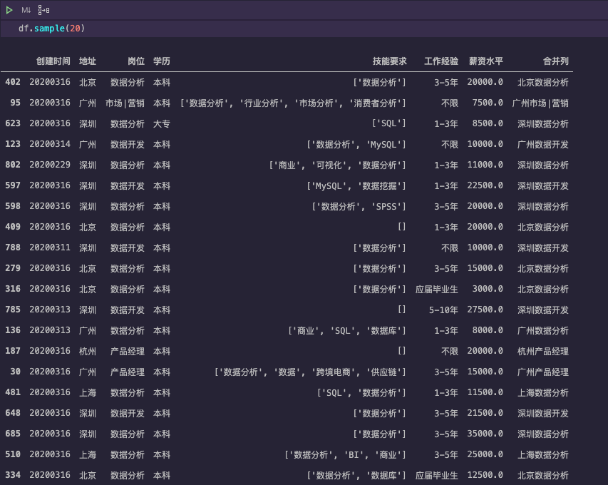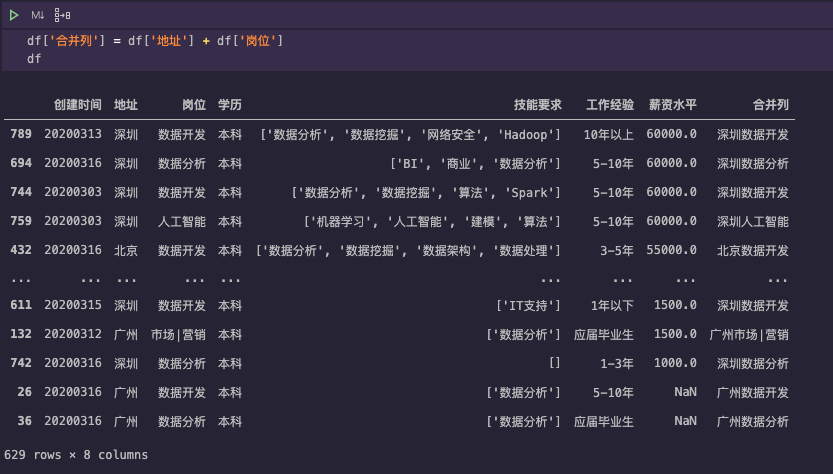 在Pandas中合并多列比较简单,类似于之前的数据插入操作,例如合并示例数据中的地址+岗位列使用df[‘合并列’] = df[‘地址’] + df[‘岗位’]