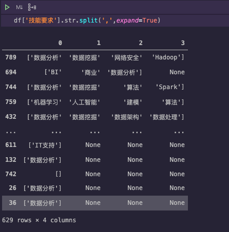 在Pandas中可以使用.split来完成分列,但是在分列完毕后需要使用merge来将分列完的数据添加至原DataFrame,对于分列完的数据含有[]字符,我们可以使用正则或者字符串lstrip方法进行处理,但因不是pandas特性,此处不再展开。