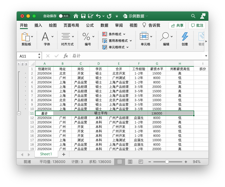 在Excel中对数据进行分组计算需要先对需要分组的字段进行排序,之后可以通过点击分类汇总并设置相关参数完成,比如对示例数据的学历进行分组并求不同学历的平均薪资