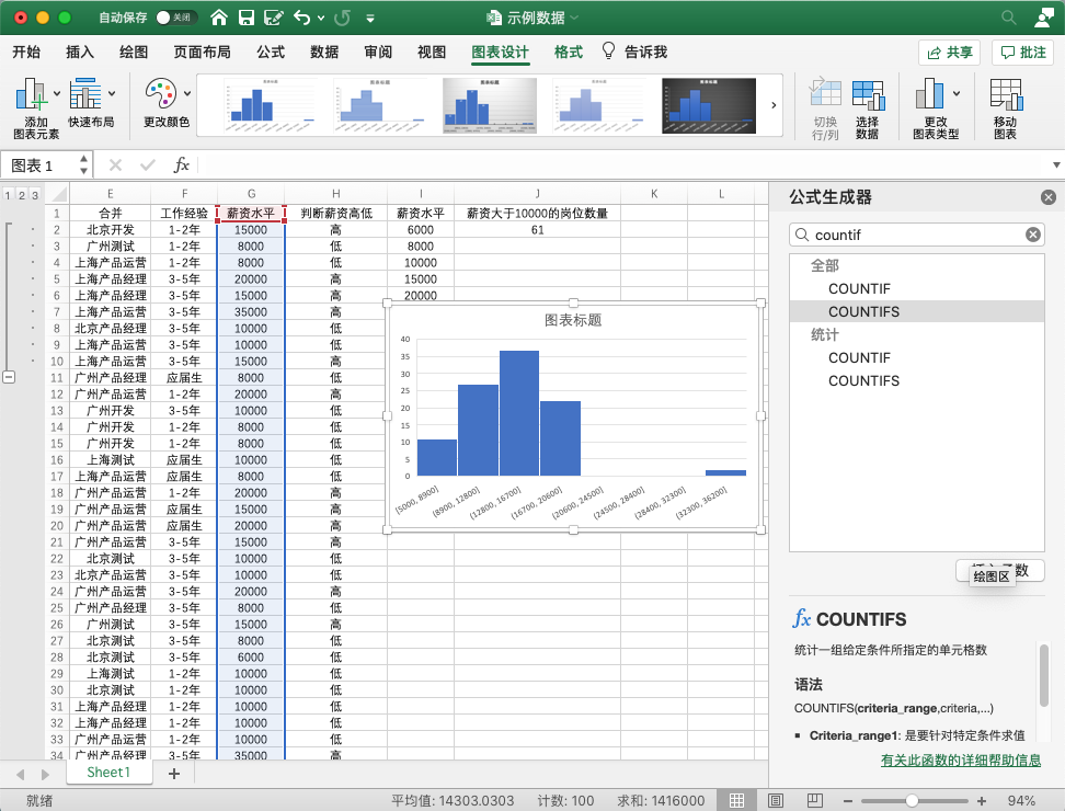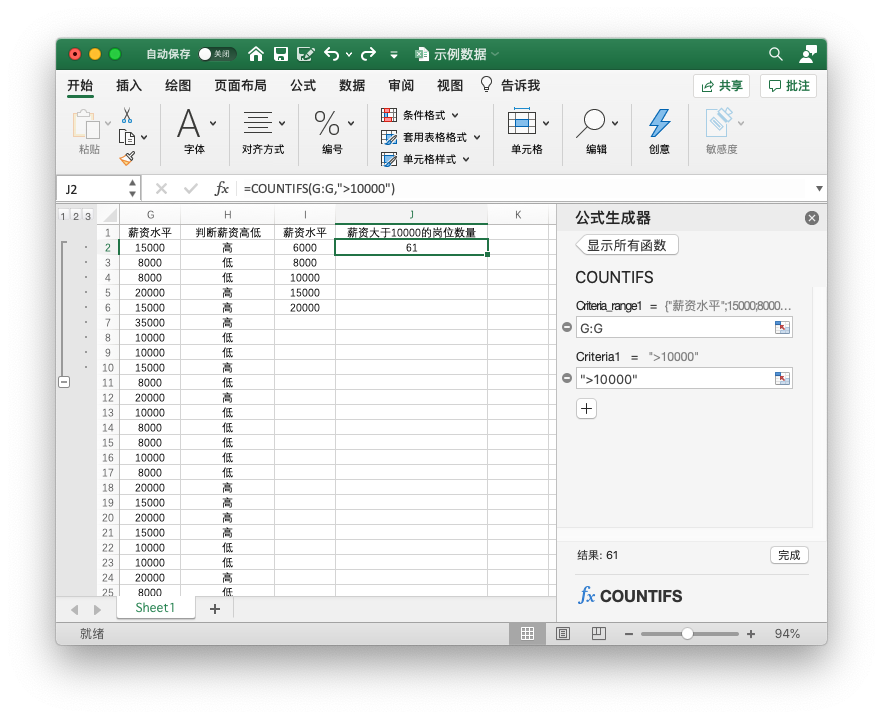 在Excel中有很多计算相关的公式,比如可以使用COUNTIFS来统计薪资大于10000的岗位数量有518个