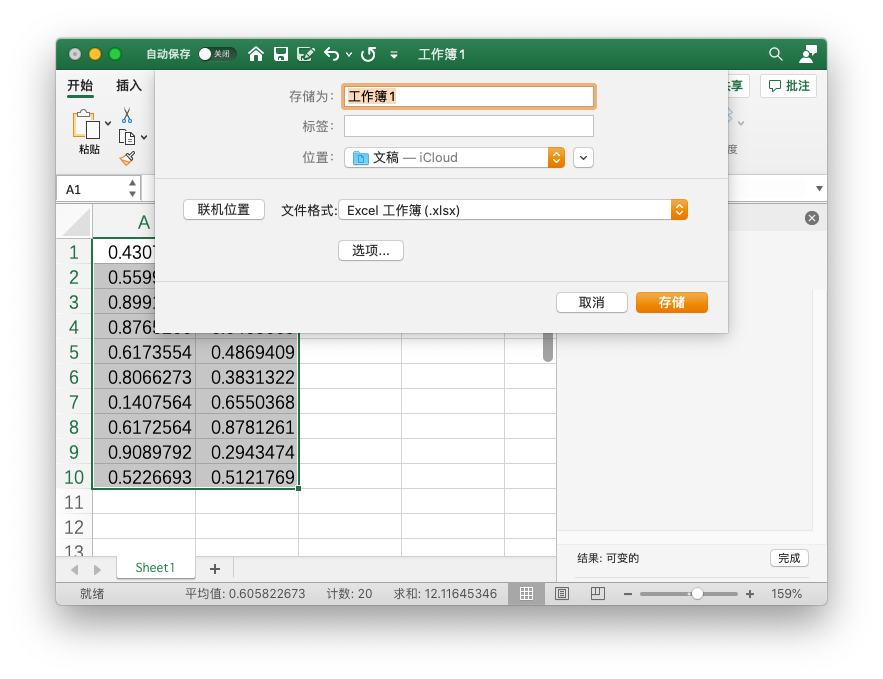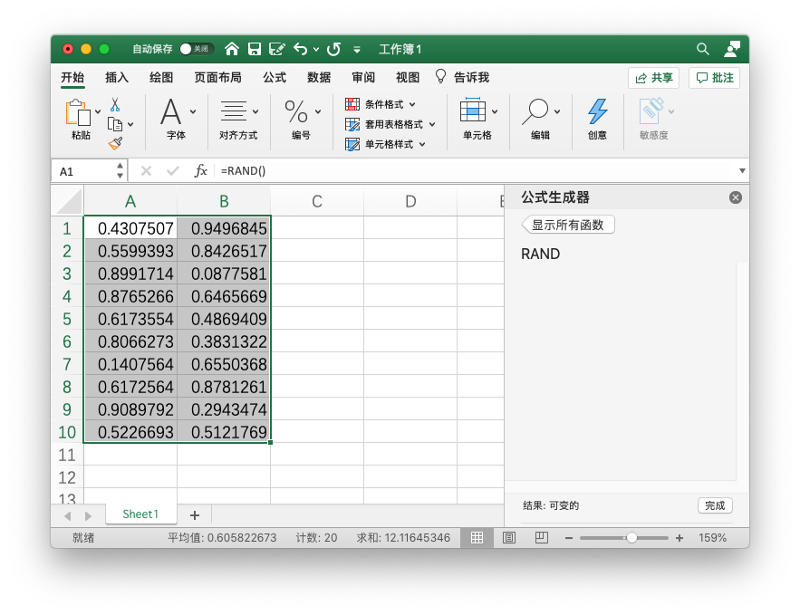 以生成10*2的0—1均匀分布随机数矩阵为例,在Excel中需要使用rand()函数生成随机数,并手动拉取指定范围