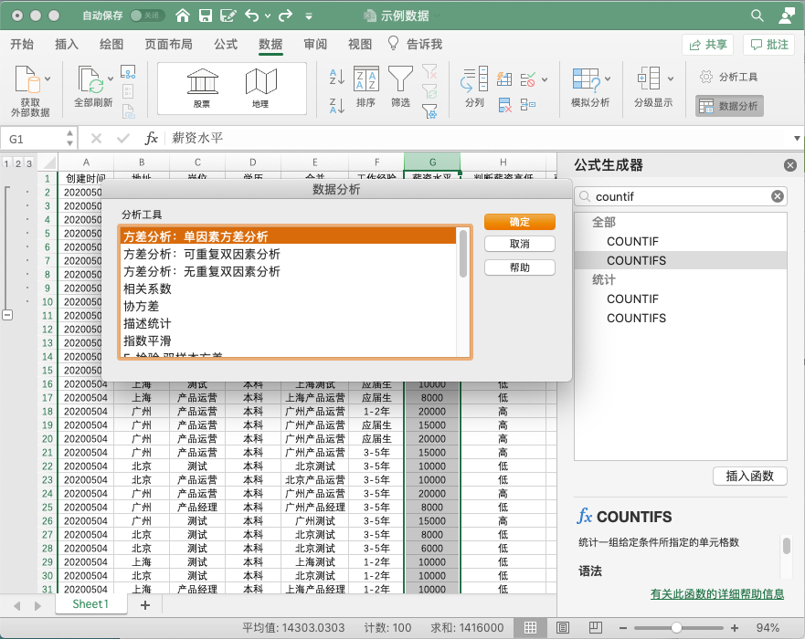 在Excel中有很多统计相关的公式,也有现成的分析工具,比如对薪资水平列进行描述性统计分析,可以通过添加工具库之后点击数据分析按钮并设置相关参