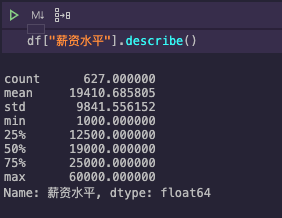 在pandas中也有现成的函数describe快速完成对数据的描述性统计,比如使用df[“薪资水平”].describe()即可得到薪资列的描述性统计结果