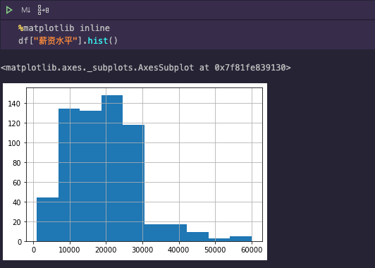 在Pandas中也支持直接对数据绘制不同可视化图表,例如直方图,可以使用plot或者直接使用hist来制作df[“薪资水平”].hist()