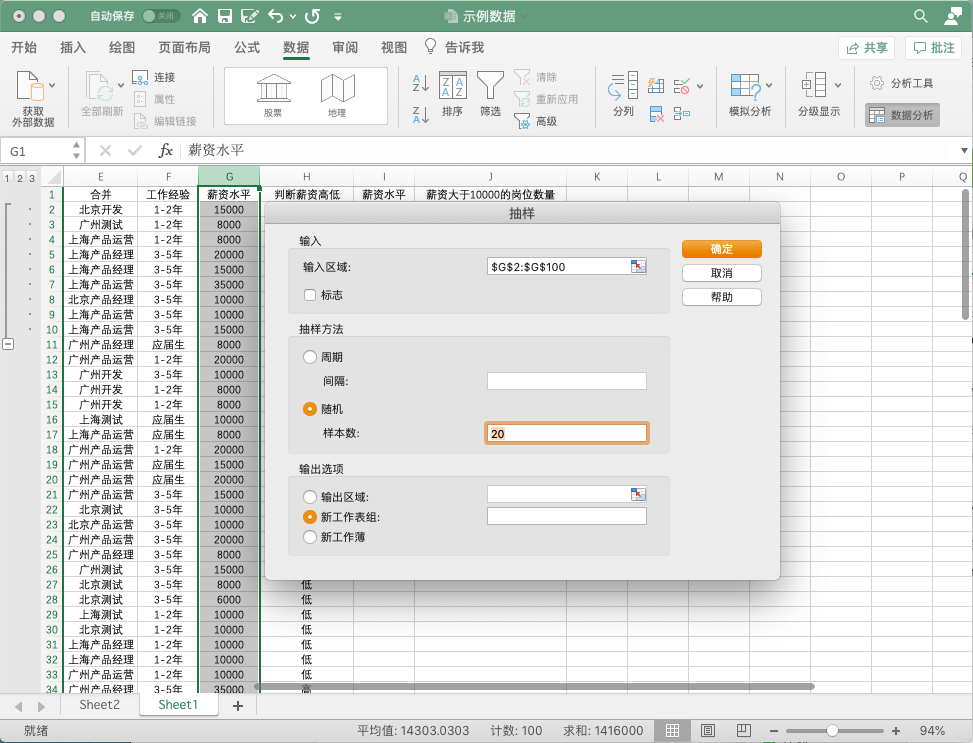 在Excel中抽样可以使用公式也可以使用分析工具库中的抽样,但是仅支持对数值型的列抽样,比如随机抽20个示例数据中薪资的样本