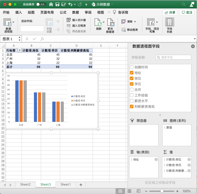 数据透视表是一个非常强大的工具,在Excel中有现成的工具,只需要选中数据—>点击插入—>数据透视表即可生成,并且支持字段的拖取实现不同的透视表,非常方便,比如制作地址、学历、薪资的透视表