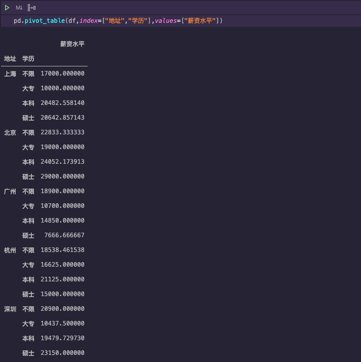 在Pandas中制作数据透视表可以使用pivot_table函数,例如制作地址、学历、薪资的透视表pd.pivot_table(df,index=[“地址”,”学历”],values=[“薪资水平”]),虽然结果一样,但是并没有Excel一样方便调整与多样