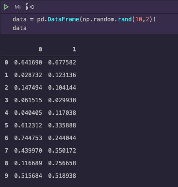 在Pandas中可以结合NumPy生成由指定随机数(均匀分布、正态分布等)生成的矩阵,例如同样生成10*2的0—1均匀分布随机数矩阵为,使用一行代码即可:pd.DataFrame(np.random.rand(10,2))