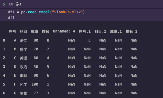在Pandas中没有现成的vlookup函数,所以实现匹配查找需要一些步骤,首先我们读取该表格
