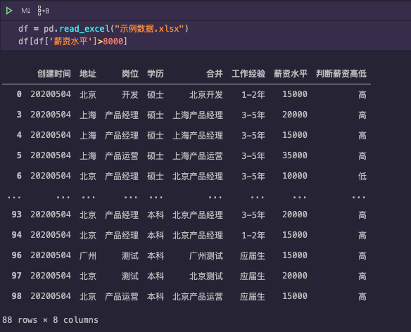在Pandas中,可直接对数据框进行条件筛选,例如同样进行单个条件(薪资大于5000)的筛选可以使用df[df[‘薪资水平’]>5000],如果使用多个条件的筛选只需要使用&(并)与|(或)操作符实现